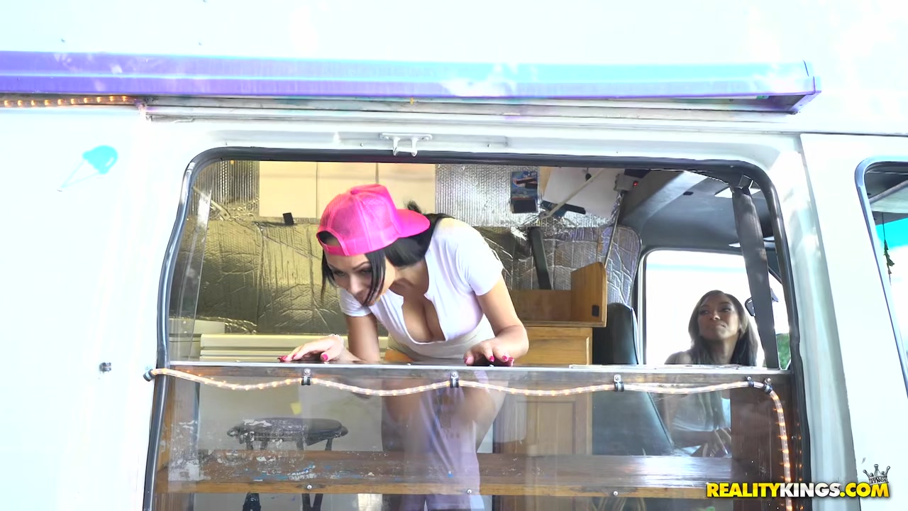 黑妞姐妹花开着冰淇淋售卖车边卖货边勾引路人大胡子男没忍住